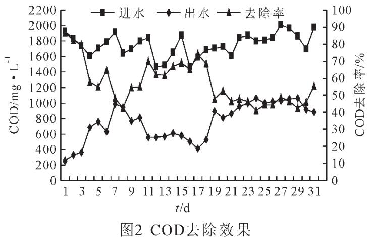 上圖為反應器穩定運行過程中COD進、出水濃度和去除率的變化情況。由于有機農藥廢水的水質不穩定,進水的COD濃度為1463.9~2013.49mg/L,有機容積負荷達12.08kgCOD/(m3·d),COD去除率為44.99%~86.72%,前3天出水COD濃度低,可能是由于活性炭的吸附作用,在吸附達到飽和后出水COD 濃度穩定在600mg/L左右。相應去除率穩定在65%左右,后期去除率又呈下降趨勢,可能是由于出水中含有少量的細小污泥絮體,引起出水COD濃度偏高。