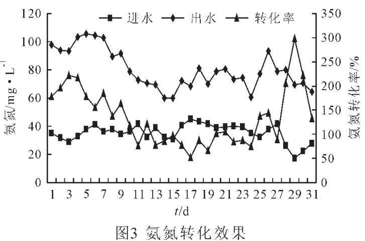 由圖3可知,進水氨氮為17.36~45.02mg/L,平均為35.33mg/L,出水氨氮為60.14~105.77mg/L,平均為80.21mg/L,系統的氨氮平均轉化率為134.85%。